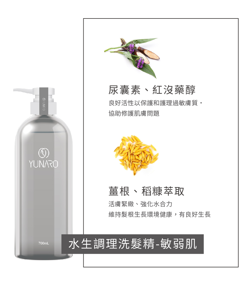 添加來自北歐的白樺樹萃取的專利成分-白樺蜜糖,維持脆弱肌膚的保護屏障、維持頭皮水分子的儲存狀態,達到高水感滋養;尿囊素、紅沒藥醇與萃取強化修護敏弱並活絡頭皮,強化水合力,維持髮肌健康狀態。