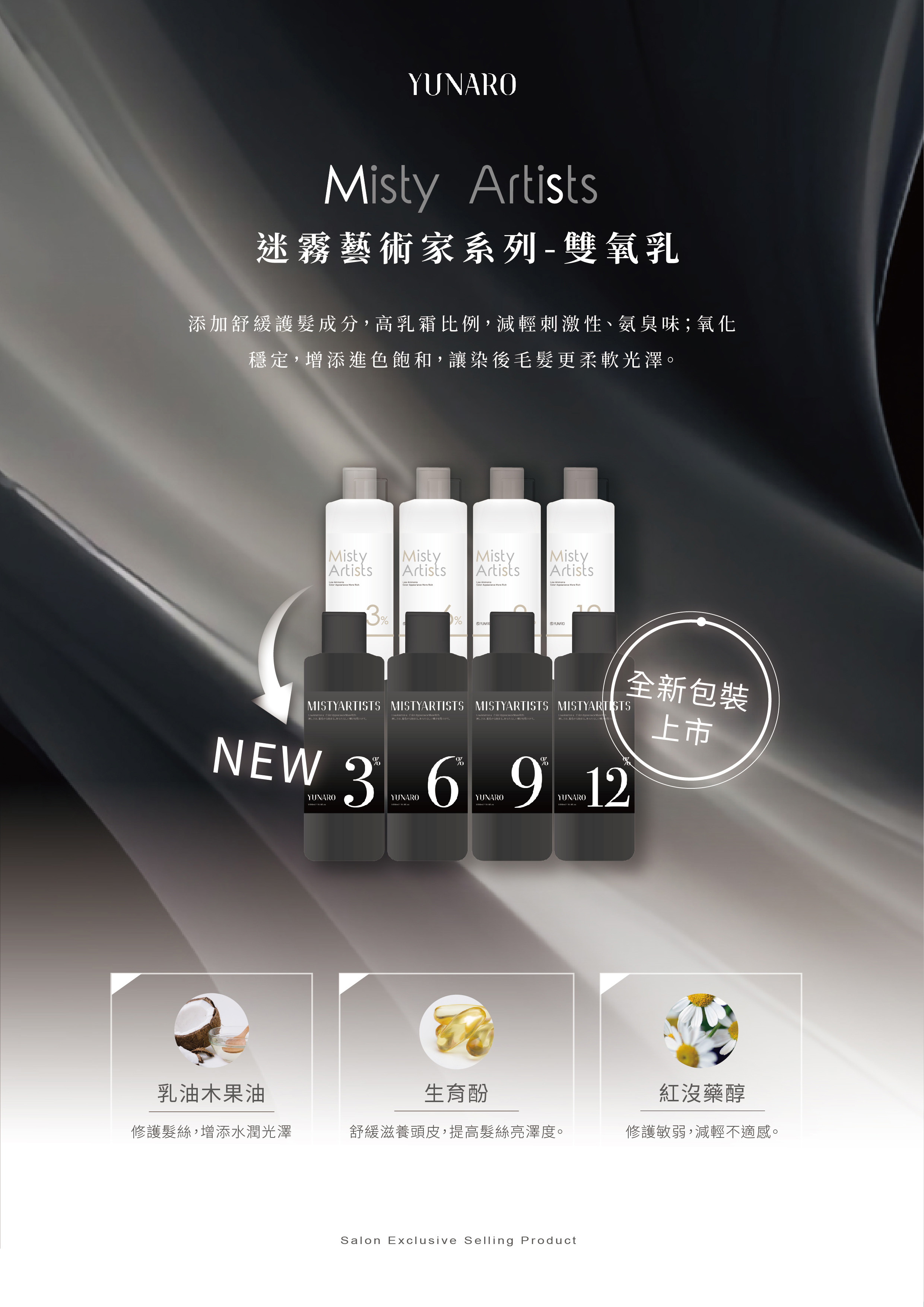 添加舒緩護髮成分,高霜比例,減刺激性味;氧化穩定,增添進色飽和,讓染後毛髮更軟光澤。